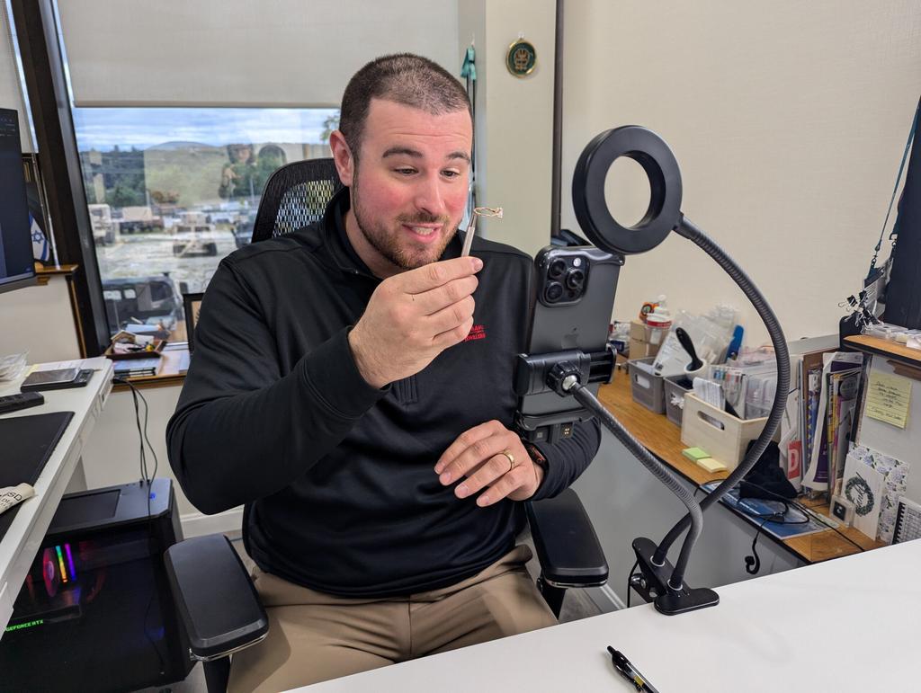 Holding up a gold-banded diamond ring, Alex Bellman explains the accessory’s features as he shows it to his phone’s front camera in his office.