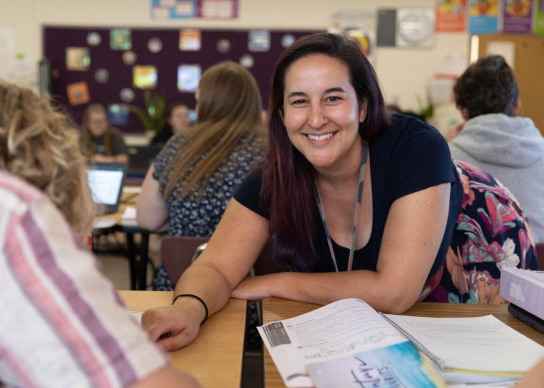 Rebecca Fortgang stops for a portrait while offering one-on-one help to students during her French 1 class on Tuesday, May 30, at Fall Mountain Regional High School in Langdon. (Photo by Hannah Schroeder)