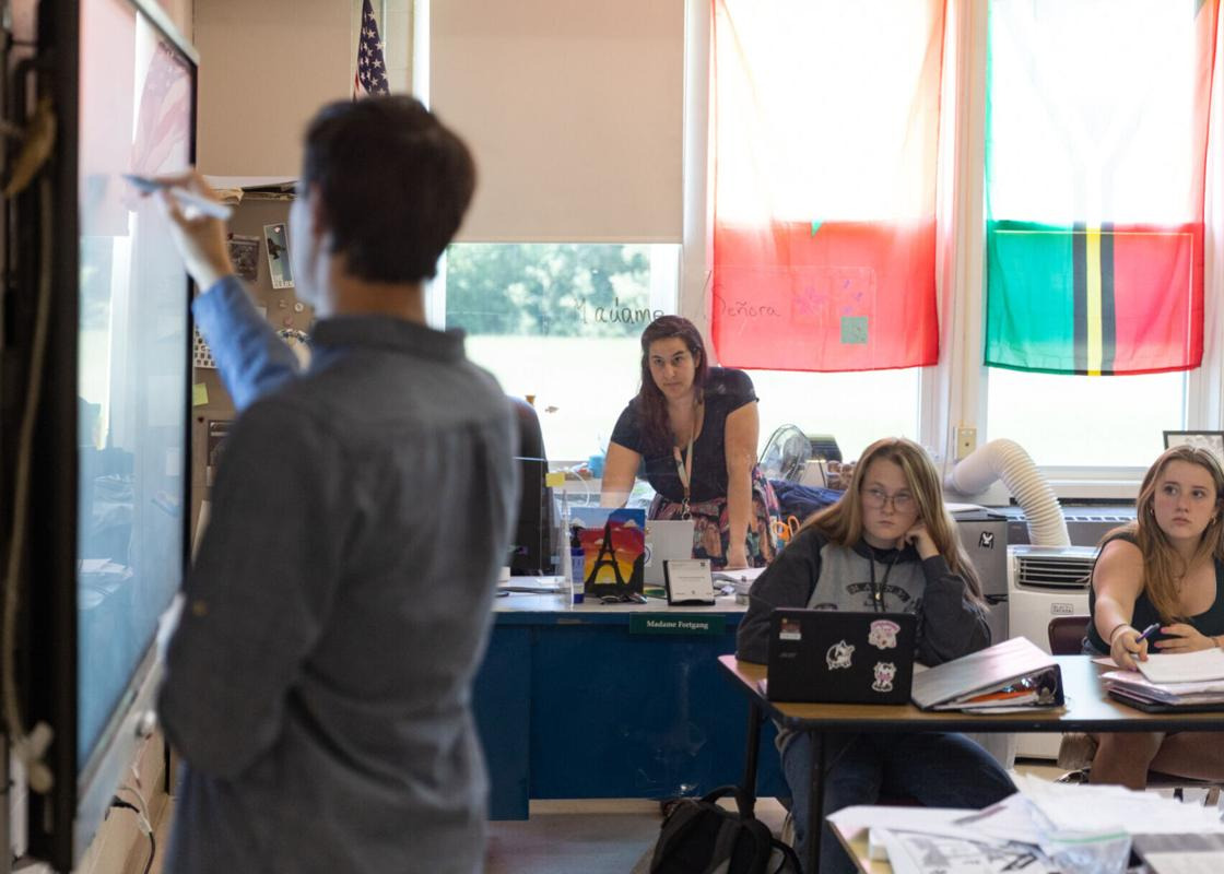 Rebecca Fortgang follows along, offering suggestions and further explanations to her students, while student teacher, senior Kaleb Houle-Lawrence, leads her French 1 class at Fall Mountain Regional High School in Langdon on Tuesday, May 30. (Photo by Hannah Schroeder)