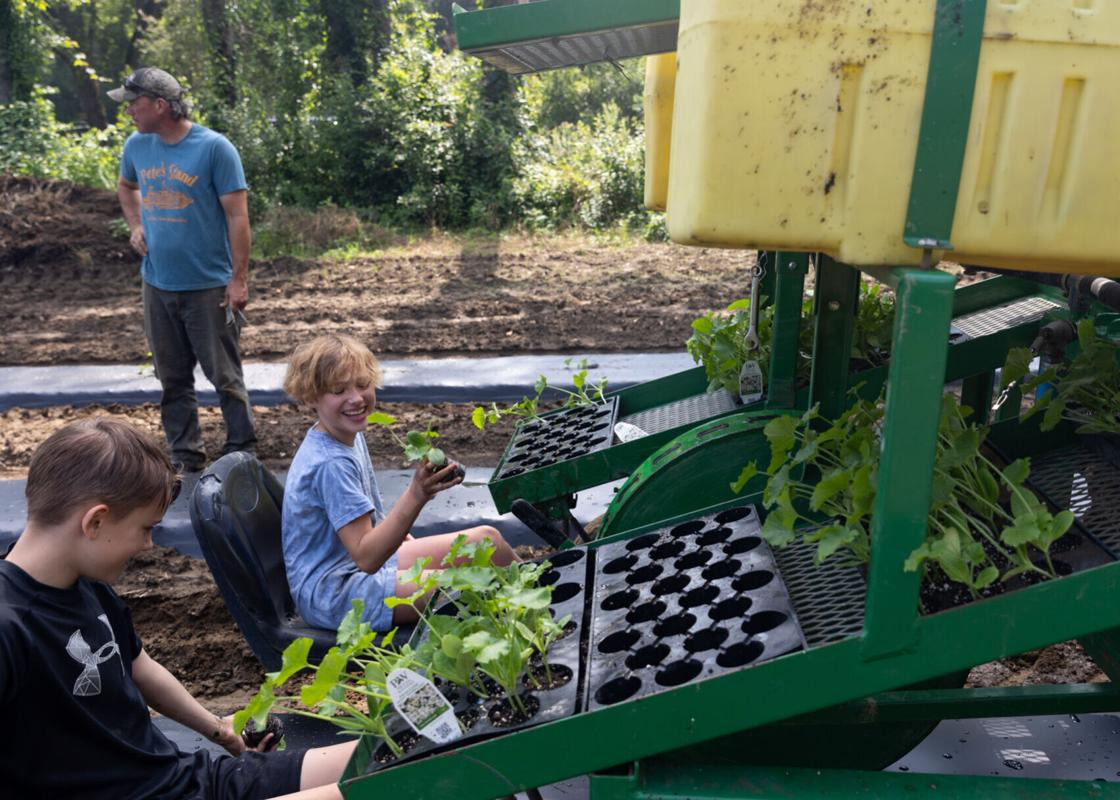 Elise, 10, and James Janiszyn, 12, help their parents plant zucchini and summer squash in their fields along Route 12 Tuesday morning after flooding ruined their current crop of vegetables. (Photo by Hannah Schroeder)