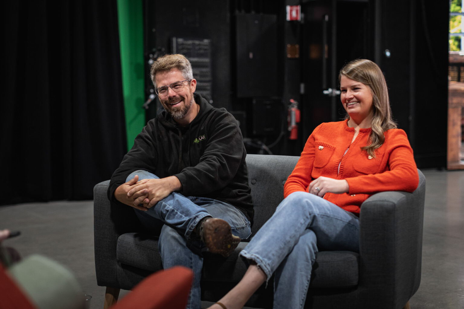 Tim Messina, left, and Carolyn Leary, right, speak with NH Business Review at Studio Lab last month, discussing their work to bring more film production to New Hampshire through a proposed common interest group. (Courtesy Pat Dunn/Studio Lab)