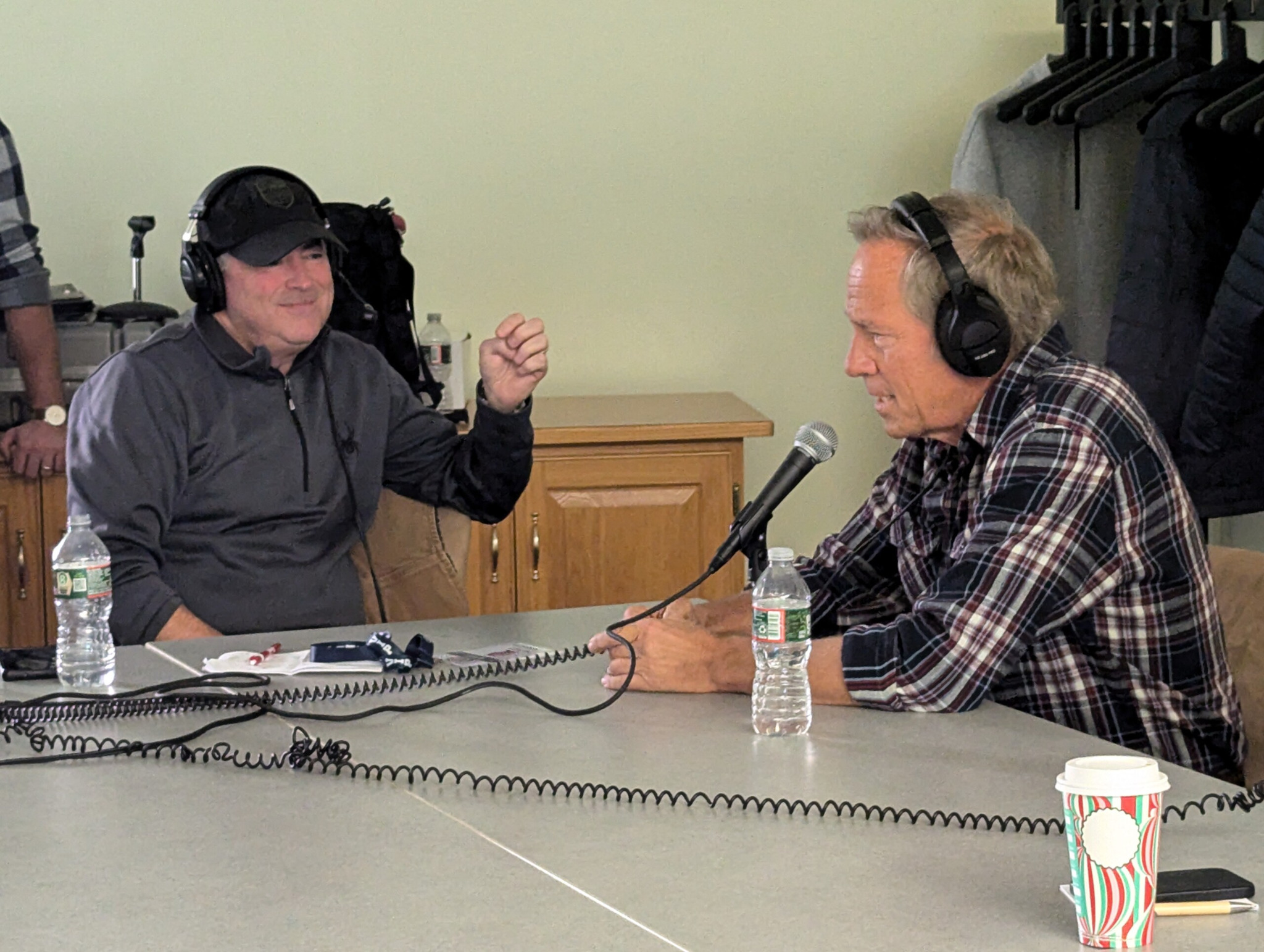 Mike Rowe chats with Jack Heath, radio host of “The Pulse of NH,” following a public appearance at the Bring Back the Trades summit on Nov. 15 at NHTI. (Photo by Trisha Nail)