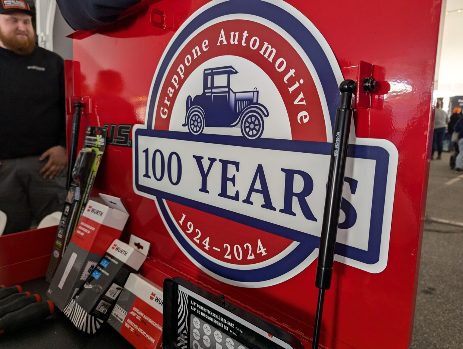A commemorative logo recognizes Grappone Automotive’s founding centennial at the Bring Back the Trades Tradeapalooza career fair. The event was the brainchild of Grappone family member Amanda Grappone-Osmer. (Photo by Trisha Nail)