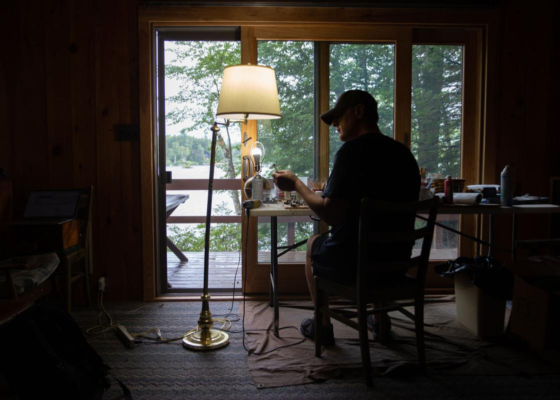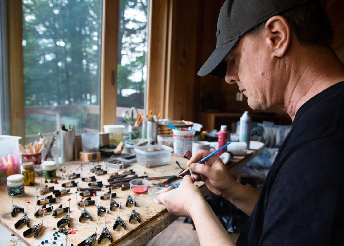 Sean Flemming of Stoddard paints the caps on his miniature mushrooms in his studio along Island Pond Monday afternoon. Flemming began creating small witch huts, mushroom dioramas and fairy houses, inspired by the Slavic folktale Baba Yaga, during the pandemic while feeling isolated from friends and family. (Photo by Hannah Schroeder)